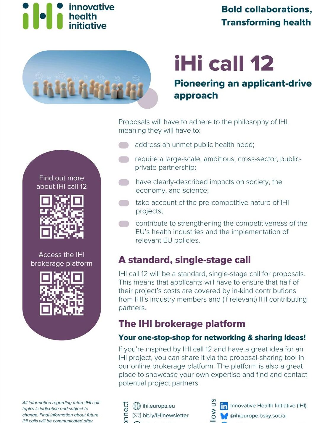 A Innovative Health Initiative (IHI) publicou a informação preliminar da Call 12, cujo lançamento está previsto para o início de 2026. A Call 12 dará continuidade à anterior Call 9, reforçando o modelo applicant-driven, permitindo que os proponentes apresentem ideias alinhadas com as prioridades da IHI, nomeadamente os 5 objetivos estratégicos definidos na Agenda Estratégica de Investigação e Inovação (SRIA), promovendo assim projetos com impacto real na saúde pública e na inovação biomédica.