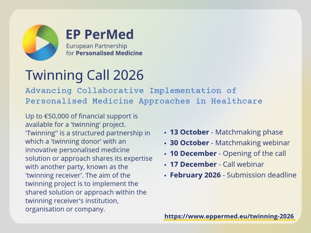 A EP PerMed – Parceria Europeia para Medicina Personalizada acaba de pré-anunciar a sua primeira Twinning Call 2026 – Promoção da Implementação Colaborativa de Abordagens de Medicina Personalizada nos Cuidados de Saúde.